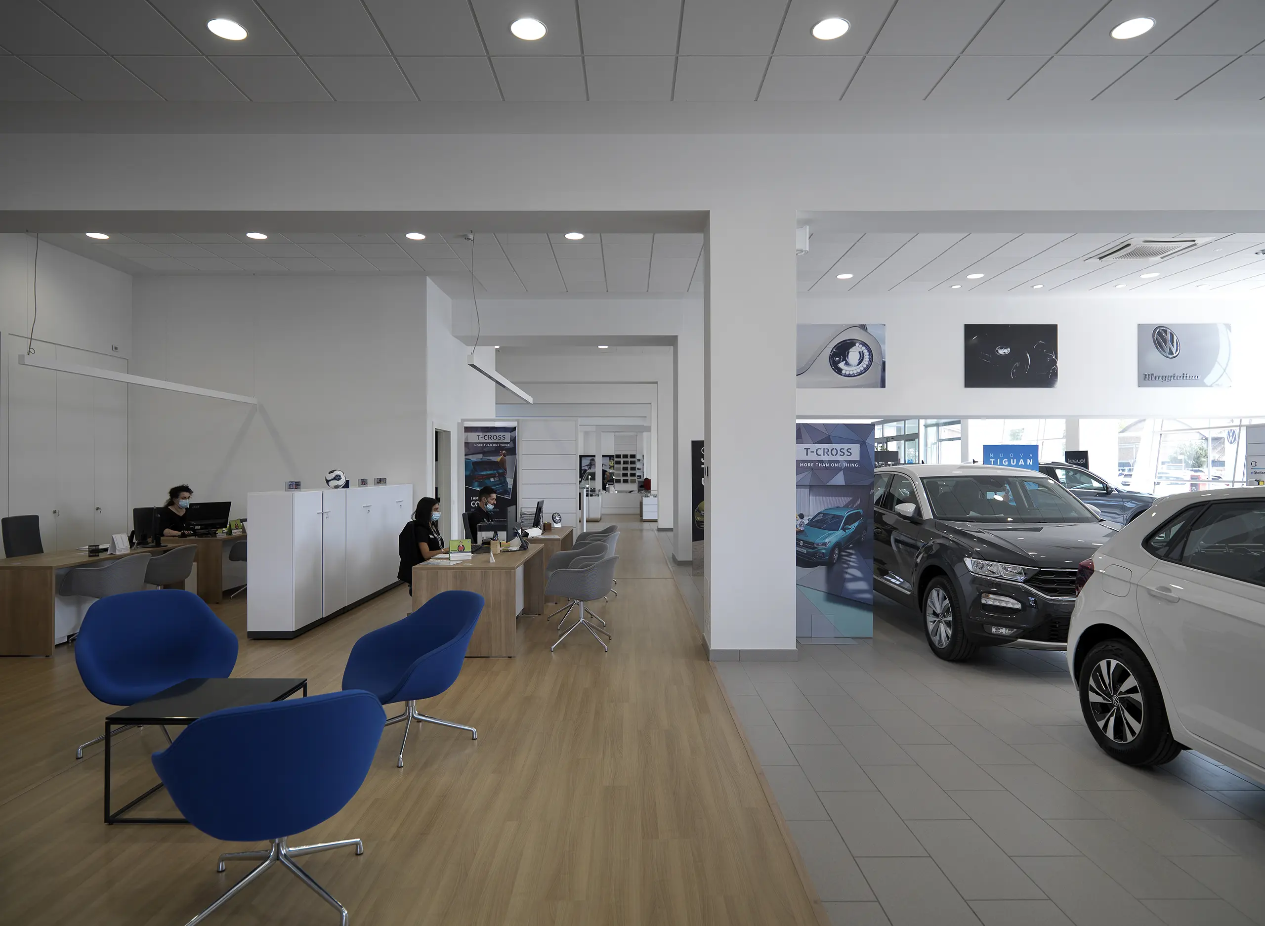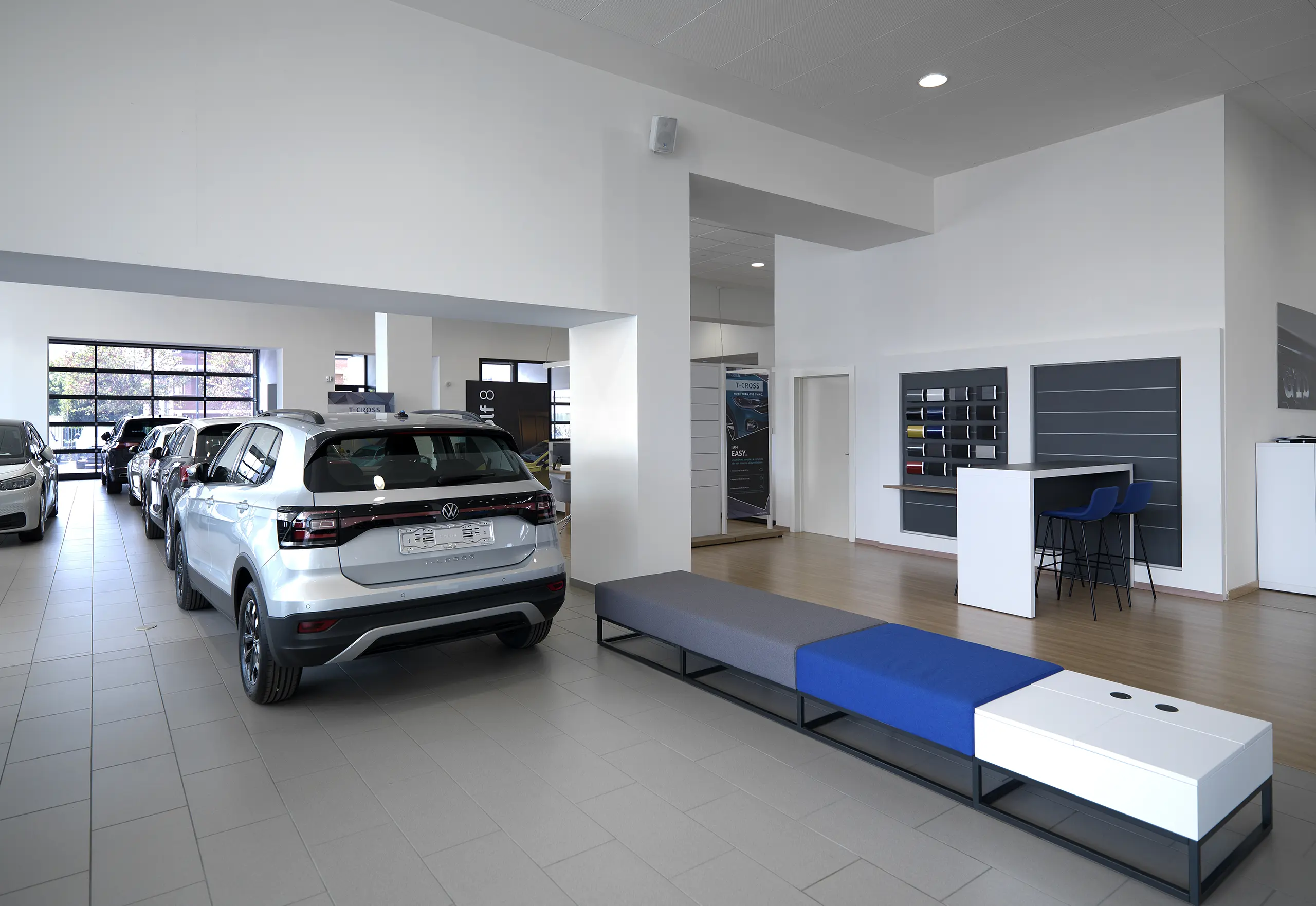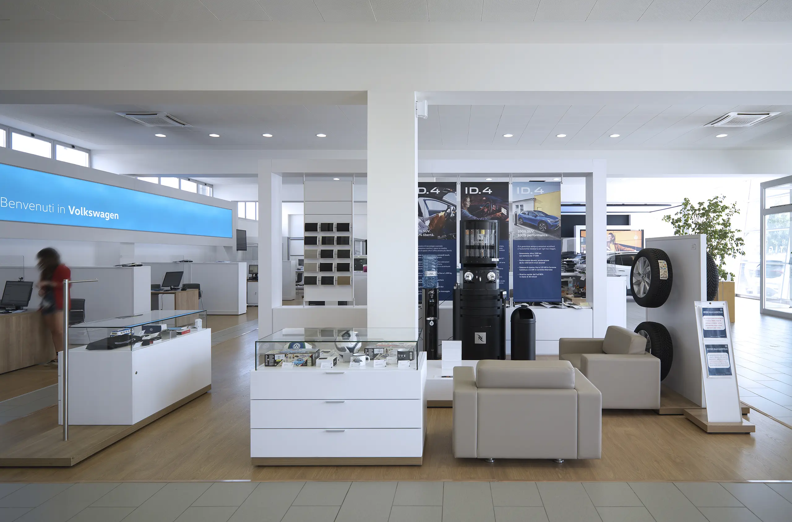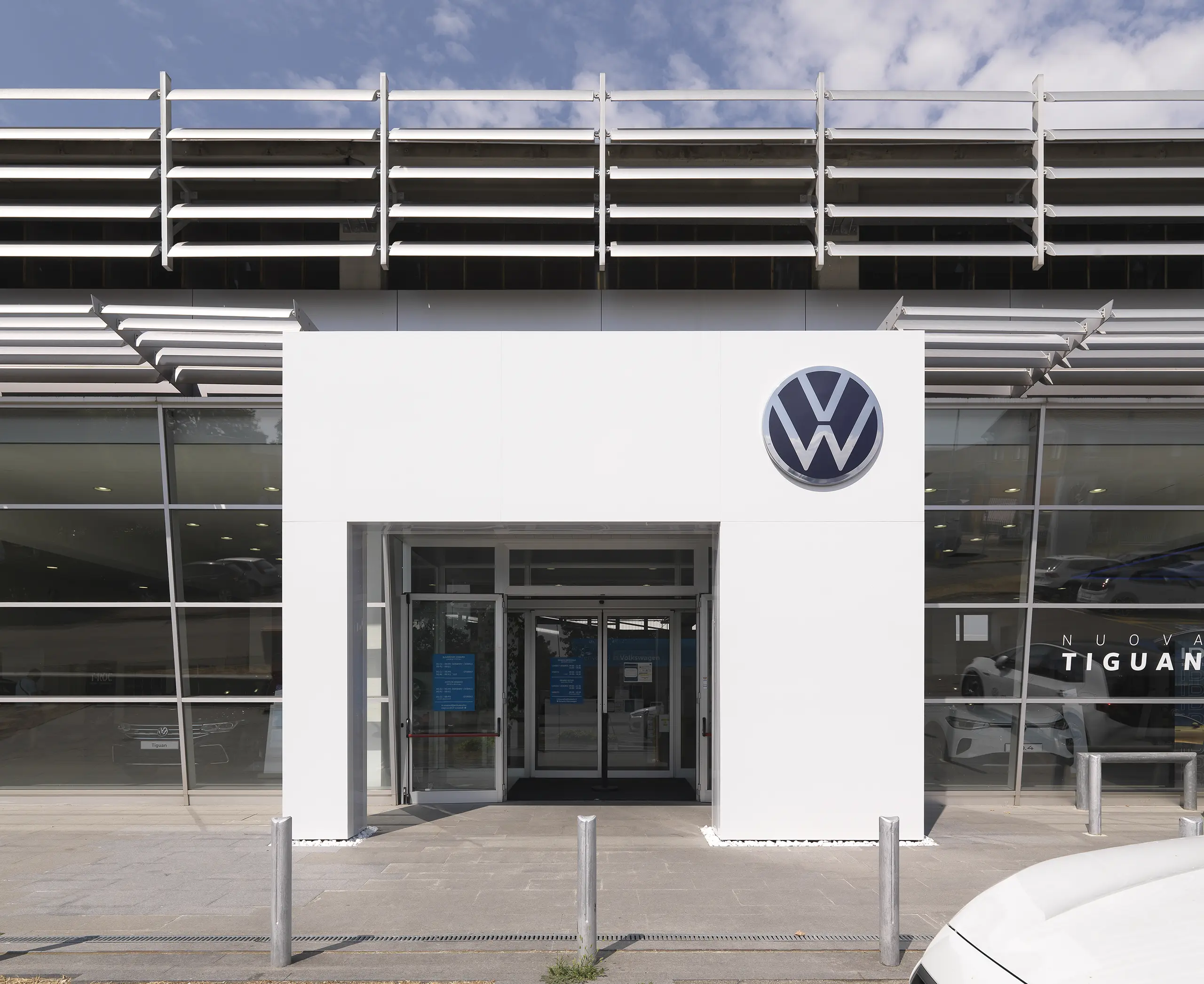 Le Opere di ristrutturazione e ampliamento della Zona Service della concessionaria Volkswagen, hanno comportato una ridistribuzione degli ambienti interni da destinare ad uffici, una riorganizzazione degli spazi esterni da adibire a parcheggio ad uso della concessionaria oltre all’ampliamento dell’ala ovest, destinata al nuovo ingresso del Service. Gli interni sono trattati con finiture semplici e al contempo domestiche, grazie all’utilizzo di legno e tinteggi chiari, in linea col concept Volkswagen, mentre l’ampliamento, trattato in Alucobond grigio metallo, si inserisce silenziosamente nello stabile esistente, apparendo come un grande portale; un grande palcoscenico da cui vengono svelate e rese fruibili le autovetture, tramite portoni sezionali in vetro acrilico.