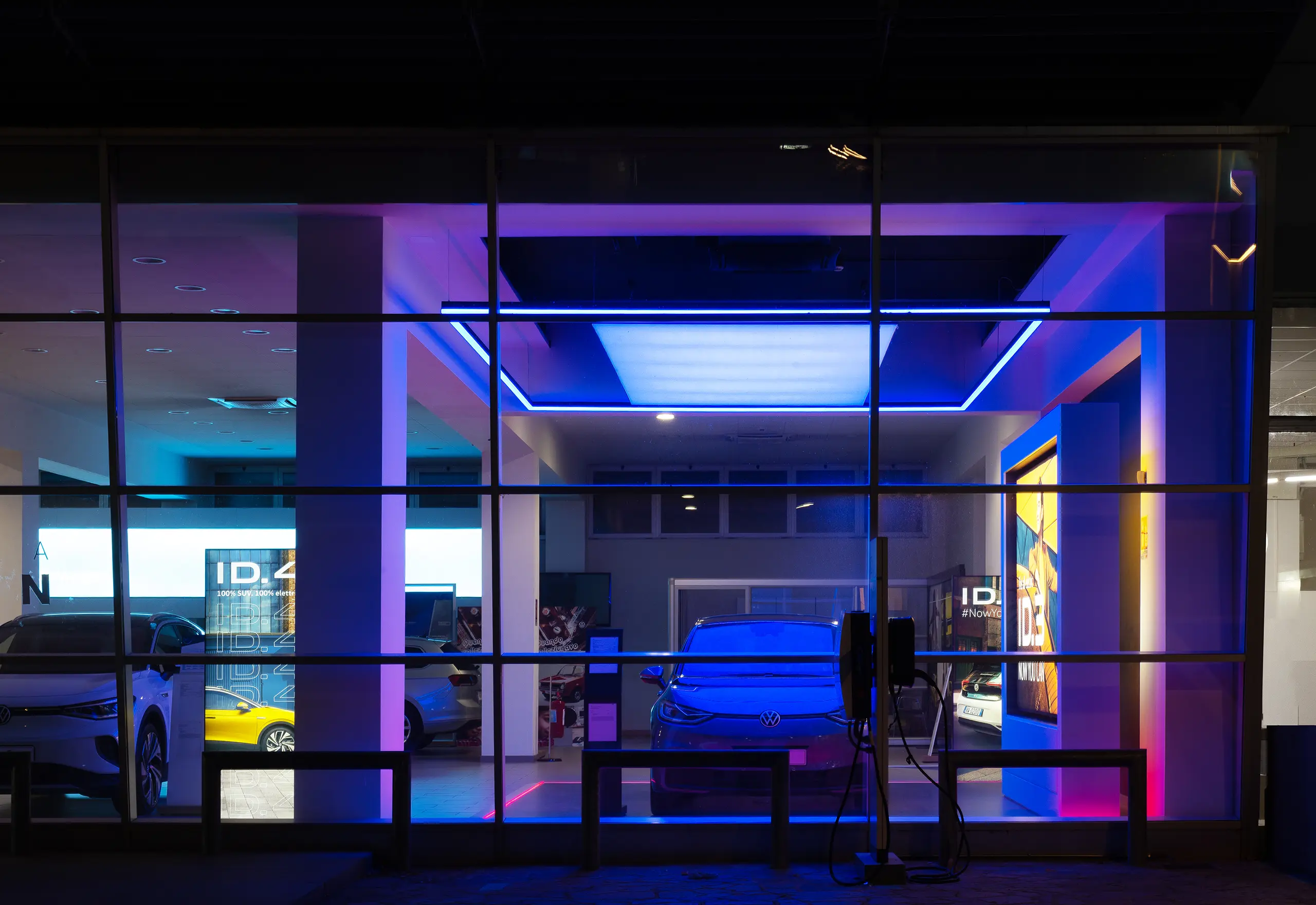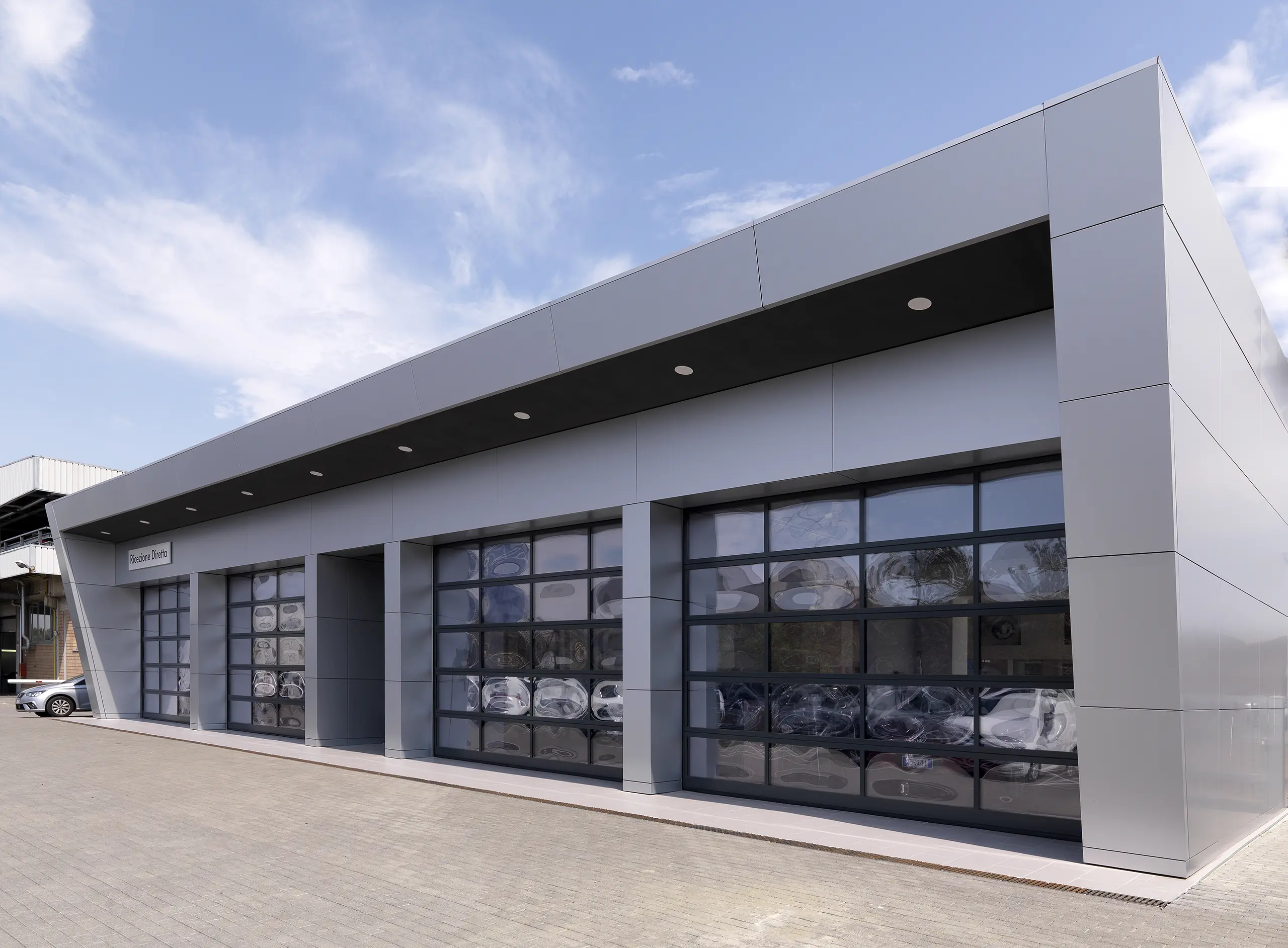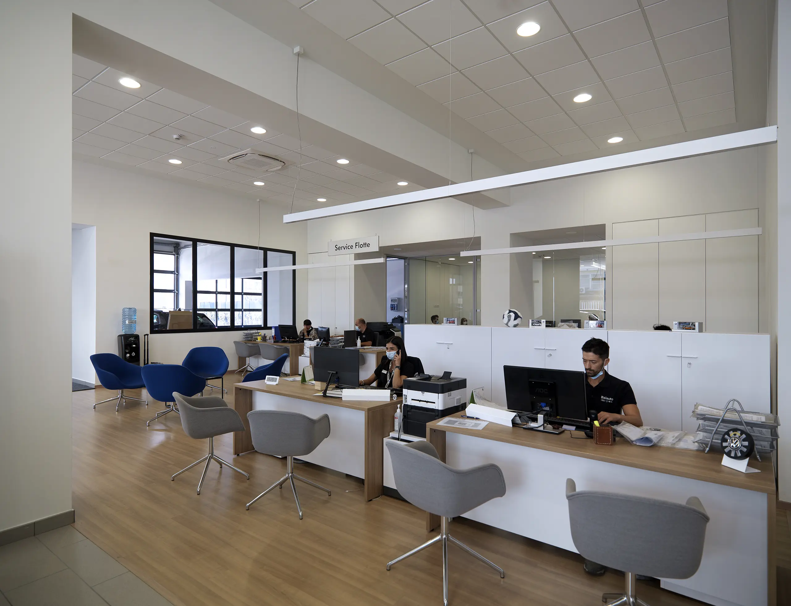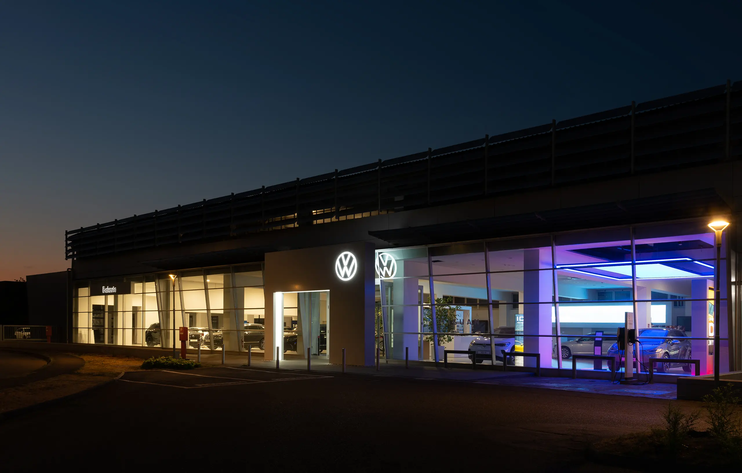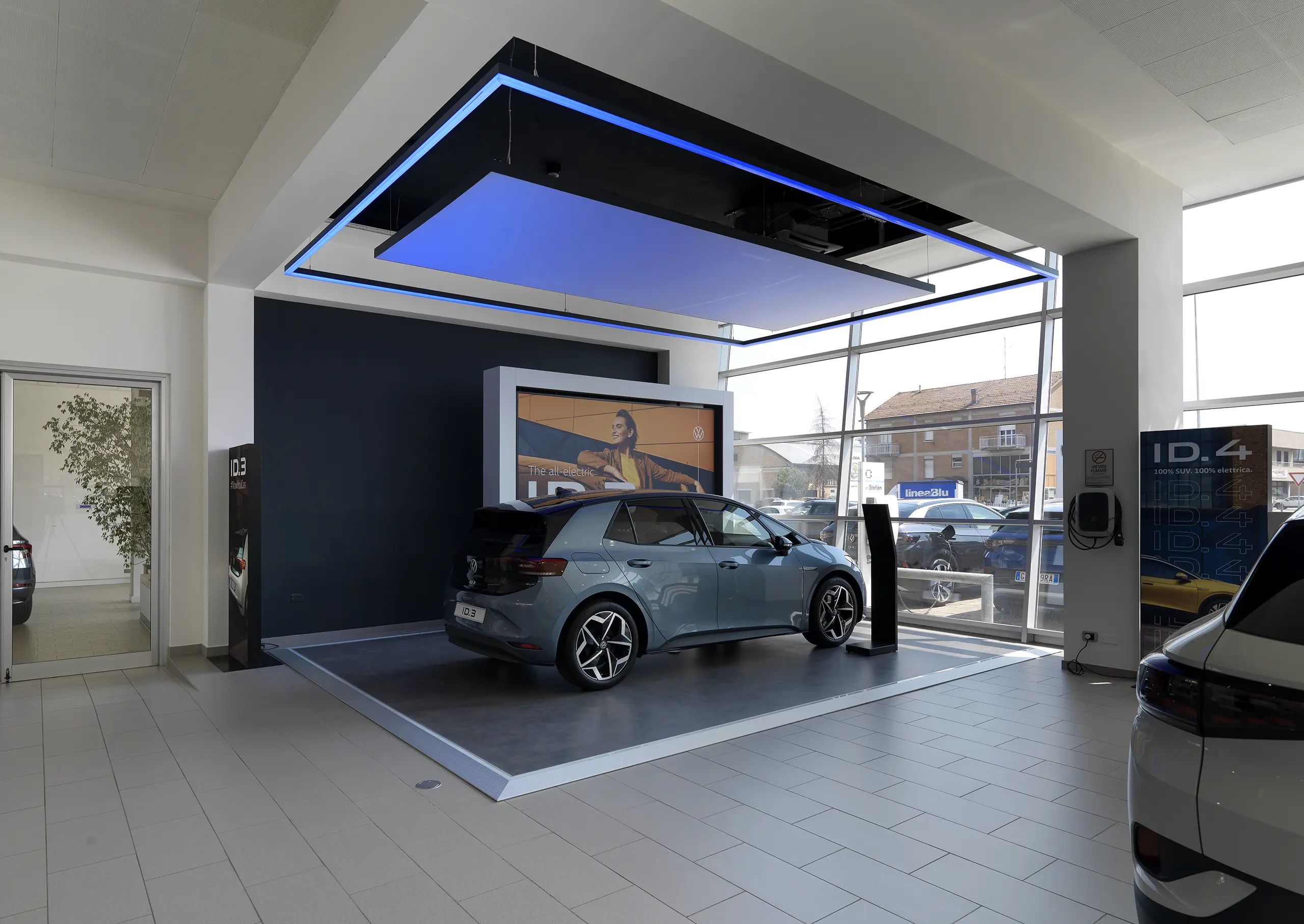 Le Opere di ristrutturazione e ampliamento della Zona Service della concessionaria Volkswagen, hanno comportato una ridistribuzione degli ambienti interni da destinare ad uffici, una riorganizzazione degli spazi esterni da adibire a parcheggio ad uso della concessionaria oltre all’ampliamento dell’ala ovest, destinata al nuovo ingresso del Service. Gli interni sono trattati con finiture semplici e al contempo domestiche, grazie all’utilizzo di legno e tinteggi chiari, in linea col concept Volkswagen, mentre l’ampliamento, trattato in Alucobond grigio metallo, si inserisce silenziosamente nello stabile esistente, apparendo come un grande portale; un grande palcoscenico da cui vengono svelate e rese fruibili le autovetture, tramite portoni sezionali in vetro acrilico.
