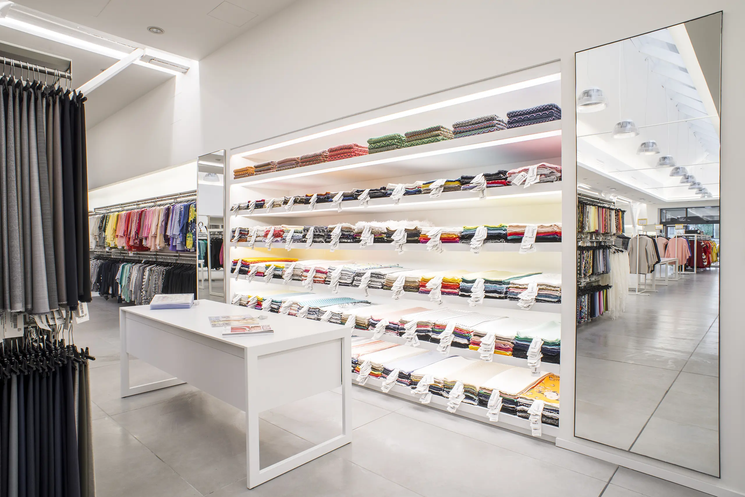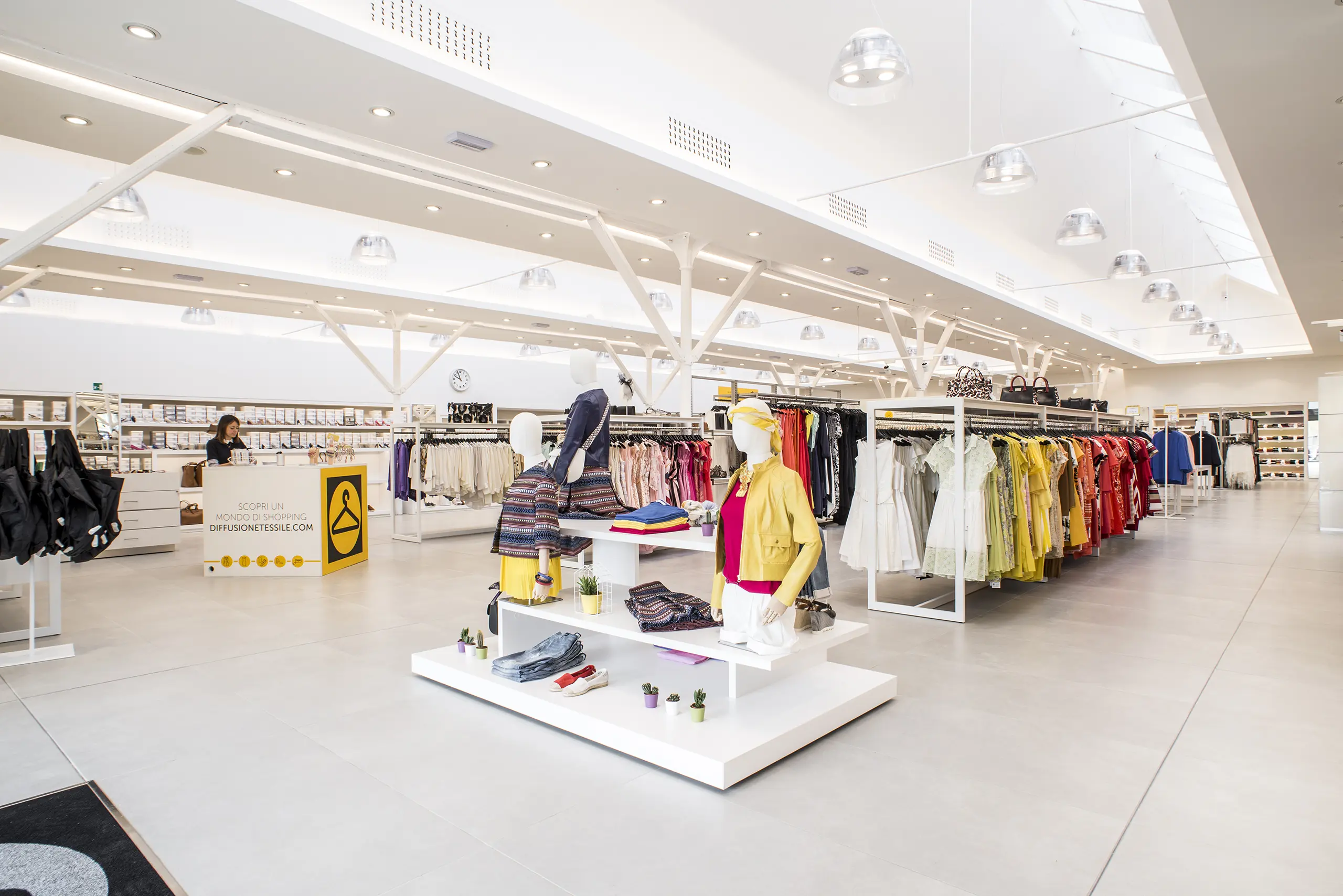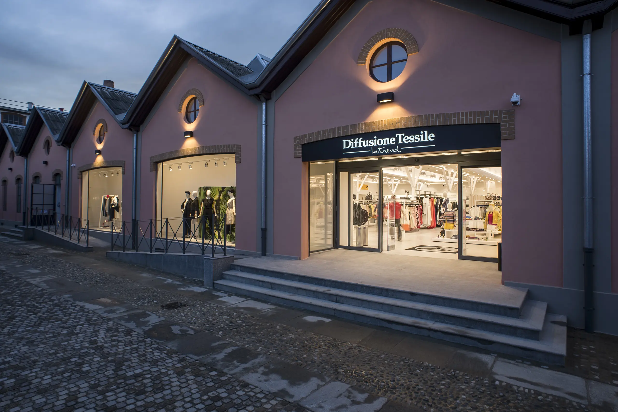 L’ampliamento e la riorganizzazione del punto vendita di Diffusione Tessile a Collegno (Torino), situato all’interno del complesso LEUMANN, pone grande attenzione al prezioso contesto storico in cui è inserito: vero e proprio esperimento sociale e urbanistico della fine dell’Ottocento, il Villaggio Operaio Leumann è il frutto dell’opinione illuminata del XIX secolo, per cui le cose utili potevano/dovevano essere necessariamente belle. Il complesso, realizzato tra il 1875 e il 1907 in stile Liberty dall’ingegner Pietro Fenoglio su commissione dell’imprenditore svizzero Carlo Giovanni Napoleone Leumann, costituito da due comprensori residenziali e dall’ex stabilimento tessile, è divenuto oggetto di tutela da parte della Soprintendenza per i Beni artistici e Culturali. L’intervento in questione si inserisce quindi all’interno di un progetto più ampio di recupero, caratterizzato da specifiche opere di restauro degli edifici costituenti il nucleo originario del Cotonificio Leumann, oltre che da un recupero a livello urbanistico dell’intera area nel suo complesso. La necessità di aumentare lo spazio di vendita del preesistente negozio Diffusione Tessile ha comportato ad una riorganizzazione completa del blocco “N”, risalente all’anno 1875. La ristrutturazione ha previsto la riorganizzazione del layout del negozio, ottimizzandone sia gli spazi espositivi che quelli logistici e adattando le finiture ad una immagine più aggiornata dell’azienda, mantenendo però visibili gli elementi strutturali originali: gli antichi pilastri in ghisa, le travi in legno della copertura e porzioni di pavimenti decorativi sono stati preservati. Le scansioni dei serramenti sui fronti principali sono state rimodulate, accorpando più finestre per realizzare vetrine più ampie, in modo da uniformare i fronti del fabbricato.
