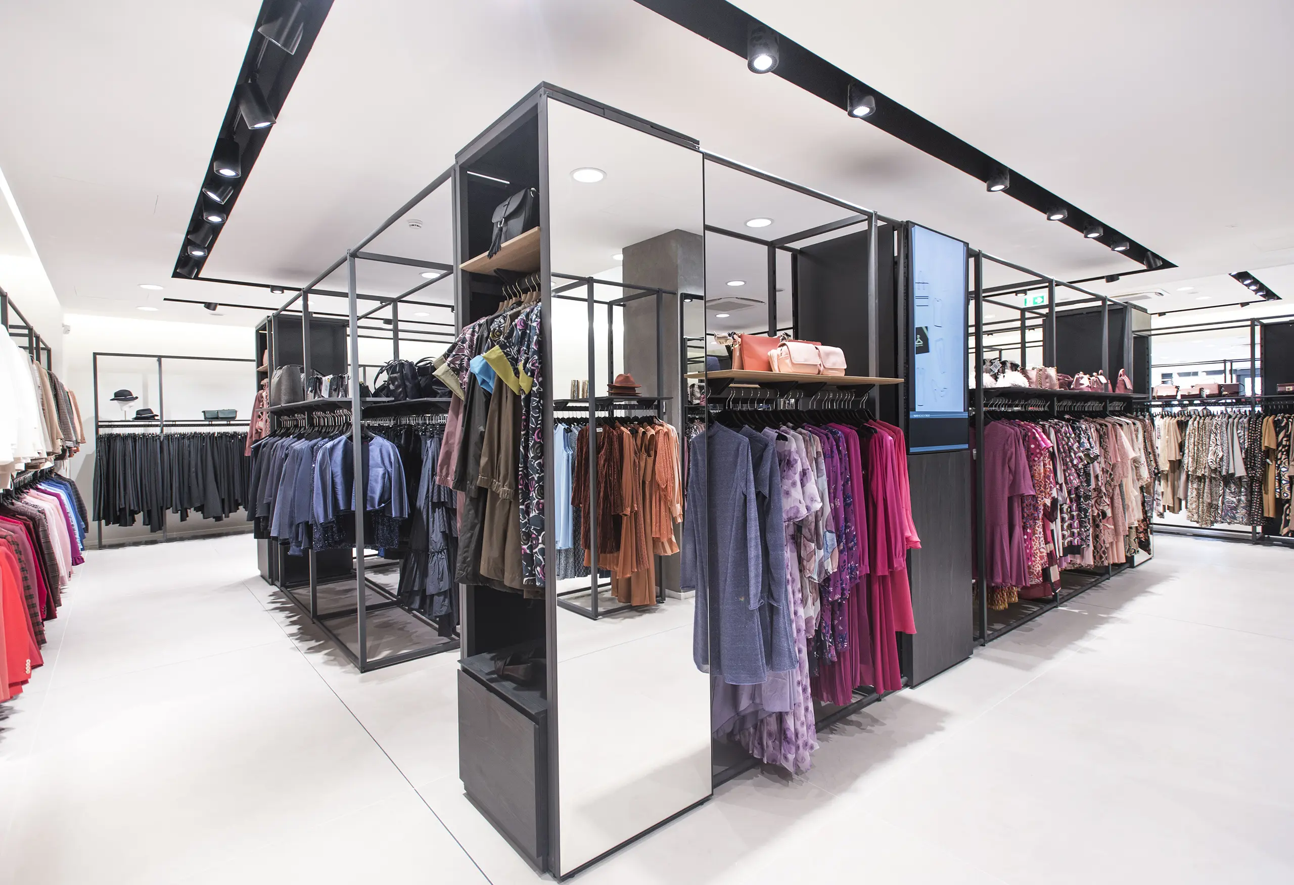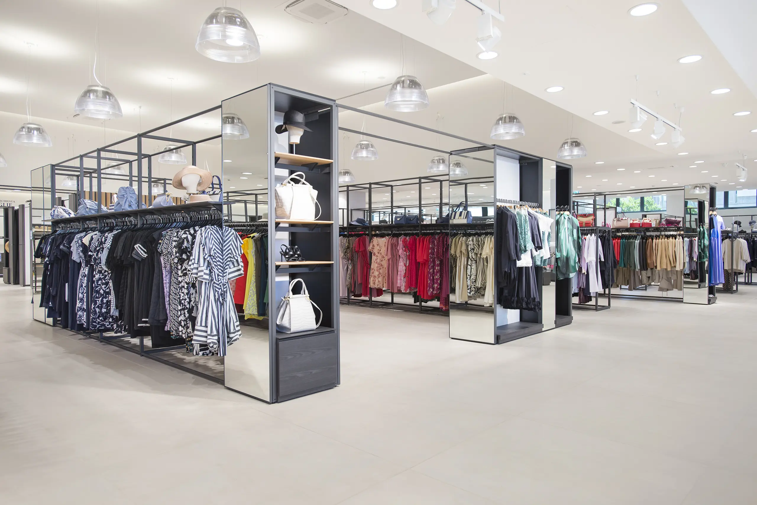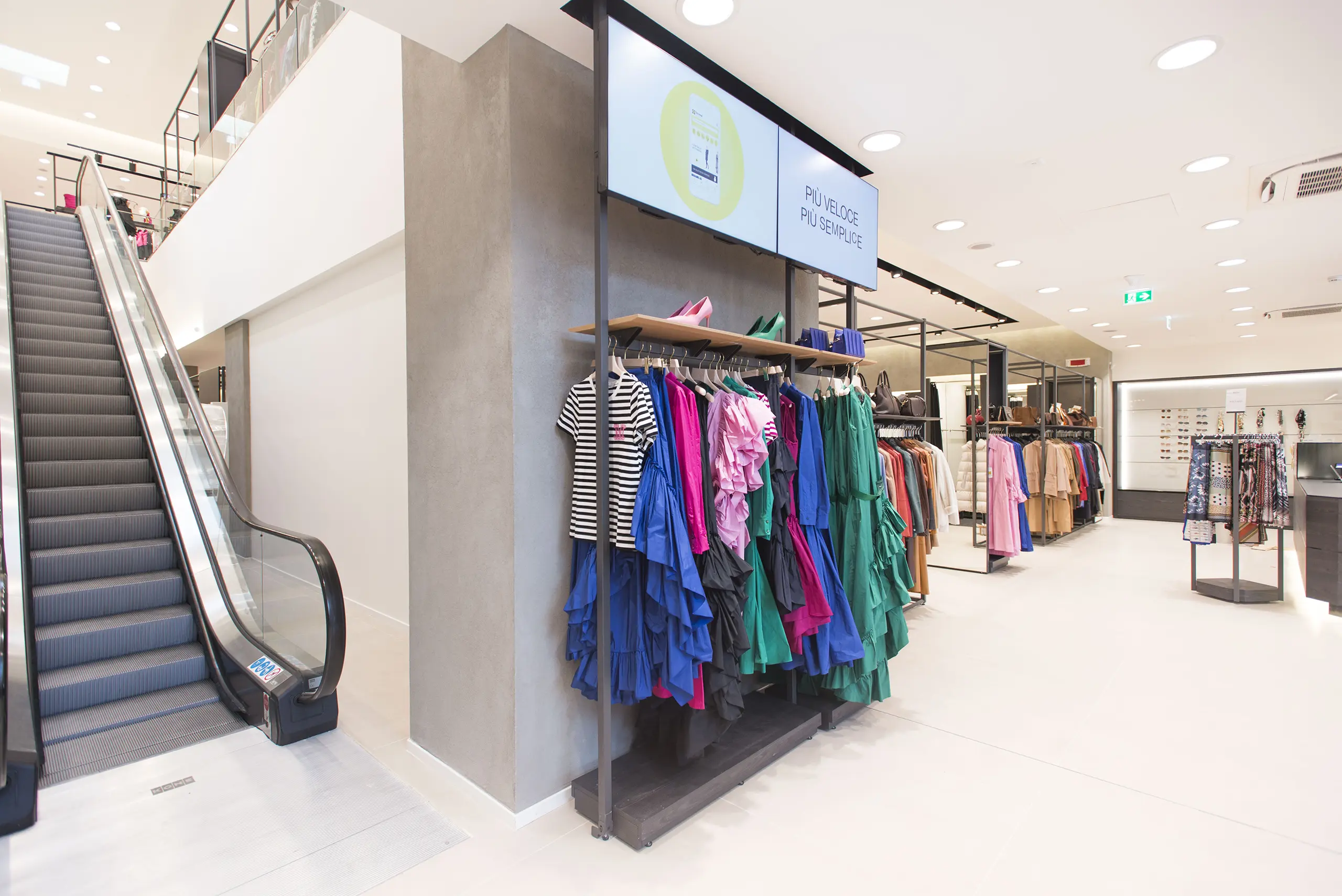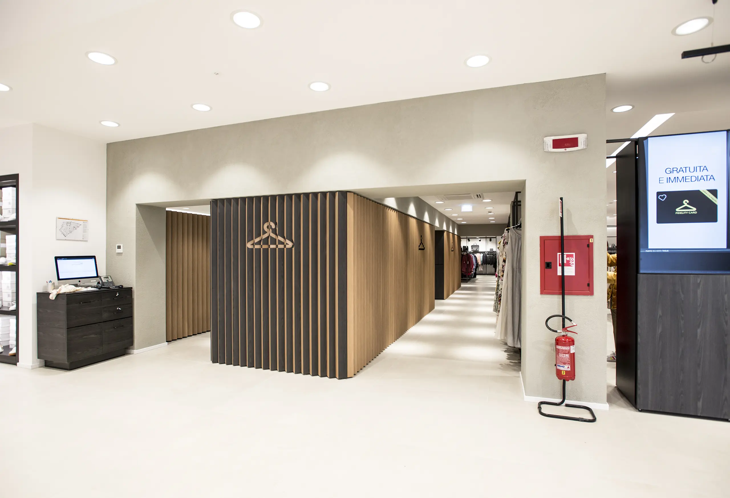 Gli arredi custom, seppur ridotti quantitativamente, caratterizzano fortemente l’immagine del brand, in un alternarsi di finiture in rovere chiaro e legno scuro, cemento e boiserie diamantate che esaltano il logo del brand grazie al principio dell’anamorfosi. L’ambiente risulta così molto più riconoscibile ma dando sempre grande attenzione al prodotto: il nuovo sistema espositivo, che abbandona l’esposizione per file tipica del mercato massivo, è caratterizzato da gabbie metalliche di colore antracite, di grande flessibilità e versatilità, che segnano fortemente lo spazio, generando stanze merceologiche, veri e propri cluster di prodotto in cui il cliente si orienta con maggiore facilità.